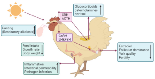 • کاهش عملکرد تولید: با افزایش دمای محیط، کاهش وزن بدن، کاهش تولید تخم‌مرغ و اندازه و کیفیت تخم‌مرغ مانند تخم‌مرغ سایز کوچک، تخم‌مرغ با پوسته نازک، آلبومین نازک، کاهش واحد هاو، شکستگی تخم‌مرغ و غیره مشاهده می‌شود.